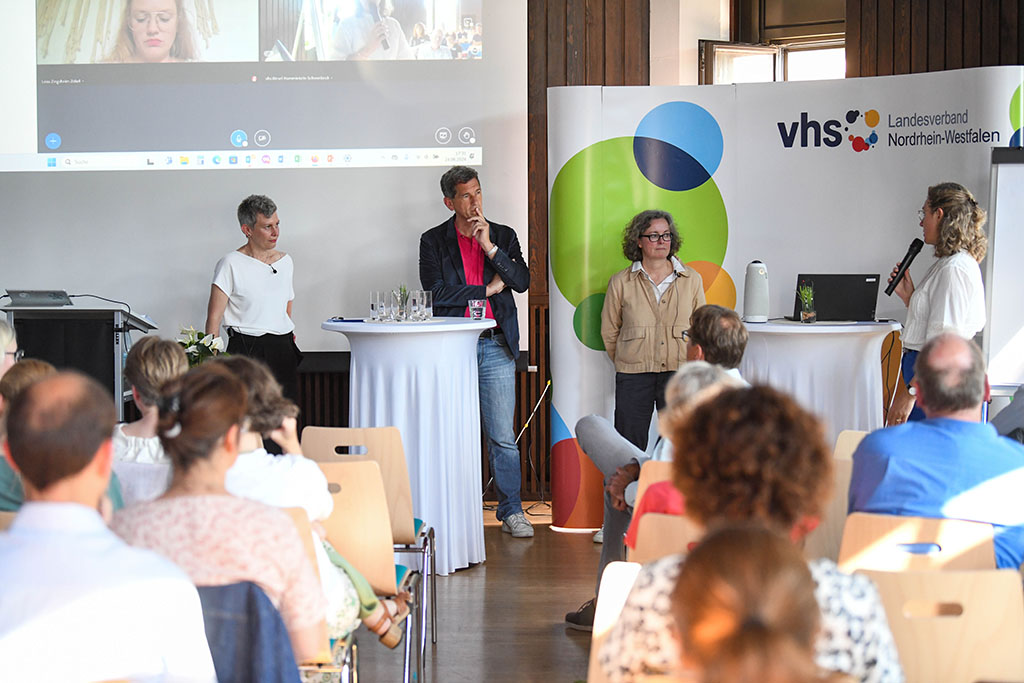 Unter dem Titel des aktuellen Arbeitsprogramms, „Die vhs2030 in NRW: Zukunftsfähig. Vernetzt. Für alle“ stand auch die vhs-Leitungstagung am 24. und 25. Juni in Wesel in den Räumen der vhs Wesel-Hamminkeln-Schermbeck. Mehr als 80 vhs-Leiterinnen und Leiter nahmen an der Veranstaltung des vhs-Landesverbands teil, die Präsident Klaus Hebborn eröffnete. Am ersten Tag ging es vor allem um die Frage, wie die Volkshochschulen dazu beitragen können, Menschen fortlaufend zu qualifizieren, damit sie den Veränderungen am Arbeitsmarkt gewachsen sind. Darüber sprachen die vhs-Leitungen am Vormittag unter anderem mit Ina Brandes, NRW-Ministerin für Kultur und Wissenschaft.
